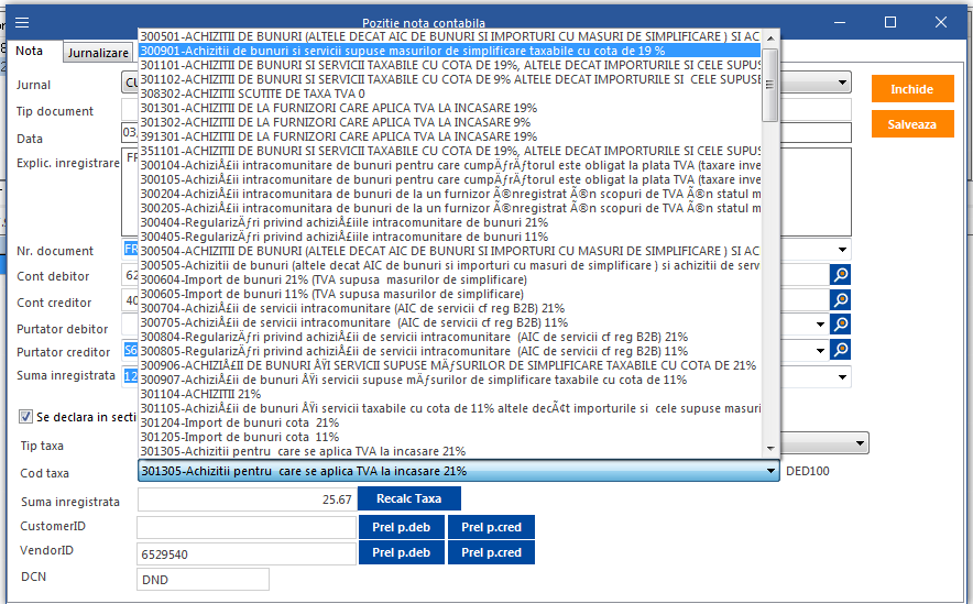 În modulul contabil, codurile de taxă se filtrează automat în funcție de tipul documentului — livrări sau achiziții. Nu mai trebuie să cauți printre zeci de coduri; apar doar cele relevante pentru documentul pe care îl completezi.